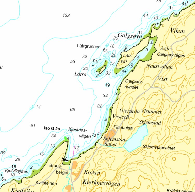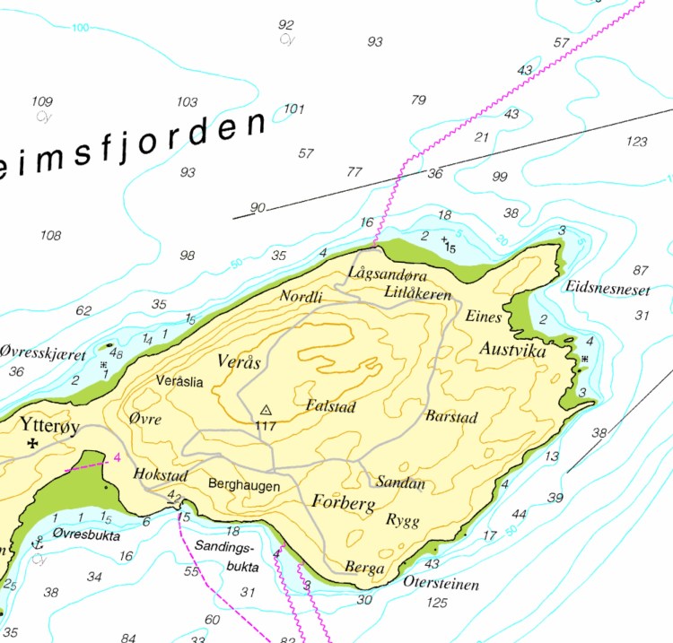 Einesvågen ligger NE på Ytterøya, og er et flott sted for en bade-stopp. Her finnes fortøyningsbøye og dybder som er egnet for ankring.